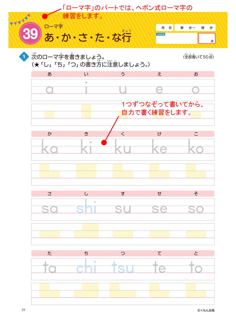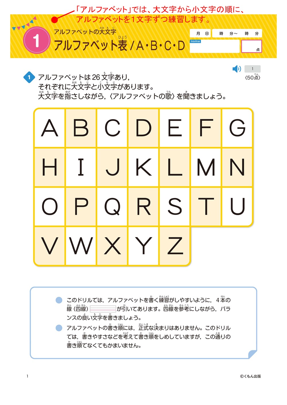 アルファベットの大文字と小文字、ヘボン式のローマ字を練習します。