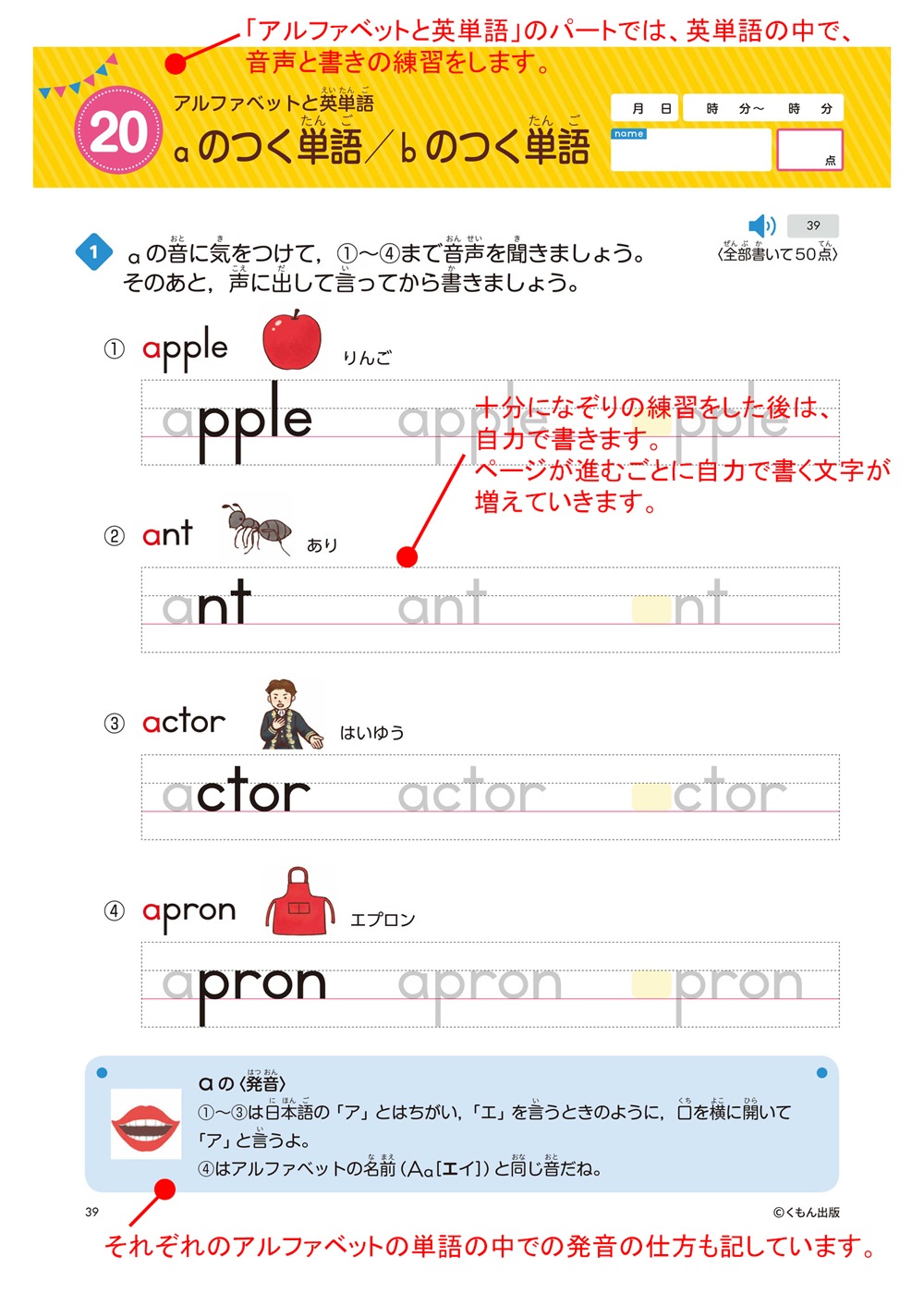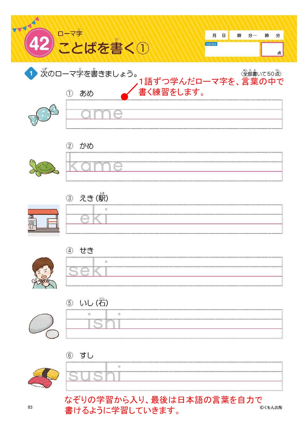 ②大文字小文字を順番に練習⇒単語の中で読み方とともに練習⇒ローマ字のルールを学びながら練習 の流れで、アルファベットの読み書きが身につきます。