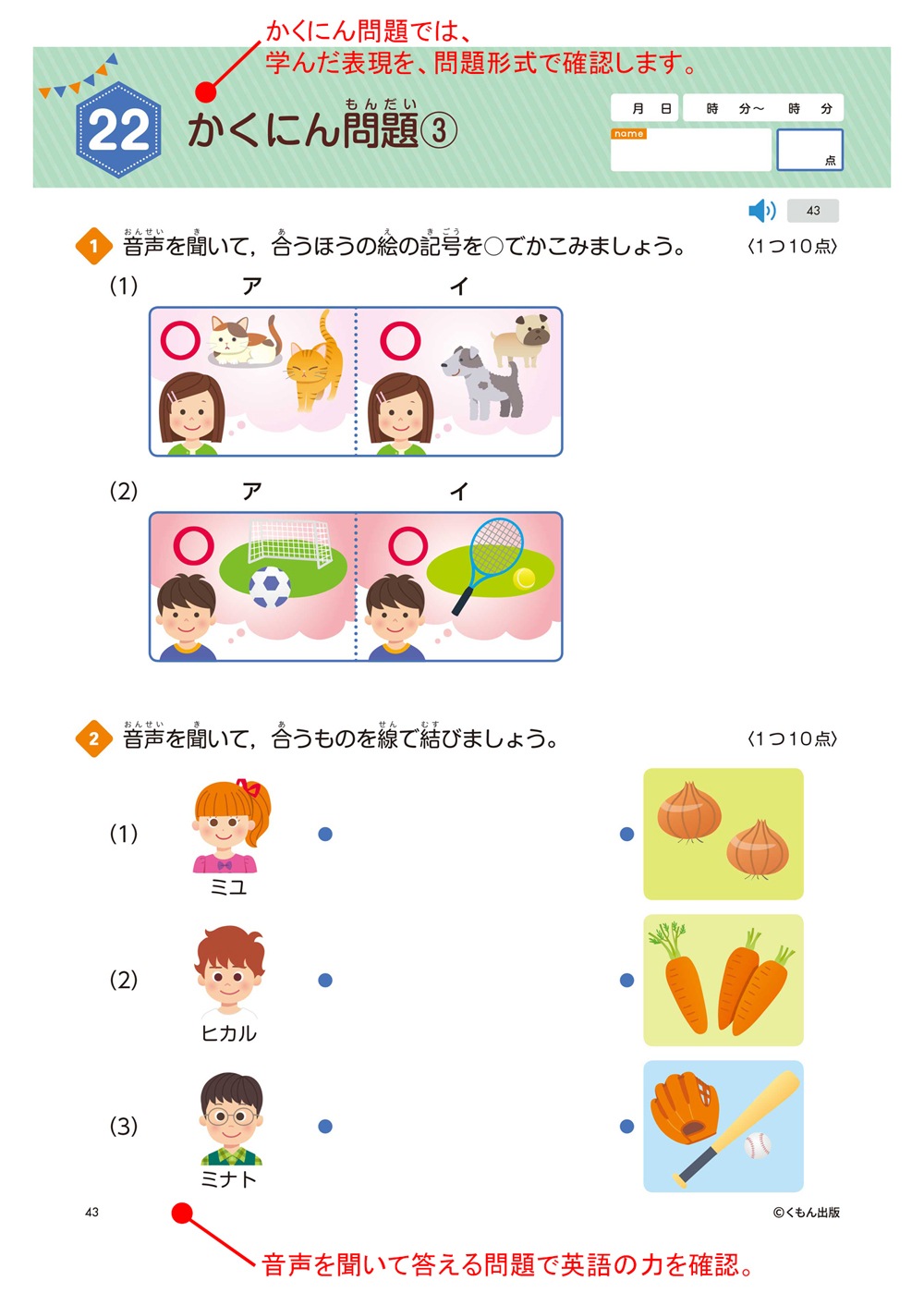 ②「あいさつ」「あいづち」「質問」など、英語学習の最初に出てくる表現を、音声となぞり書きで学習していきます。