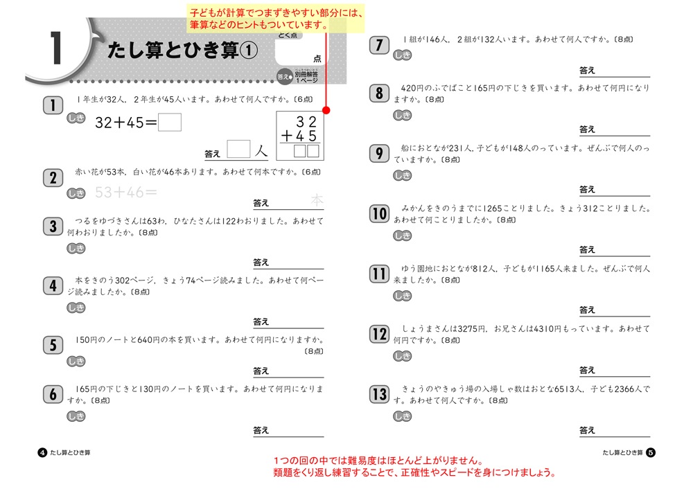 「式の立て方をくりかえし練習できる」「細かいステップにより,難易度が急激に上がることを防ぎ,止まることなく学習することができる」という特徴により,学習の力を着実につけることができます。