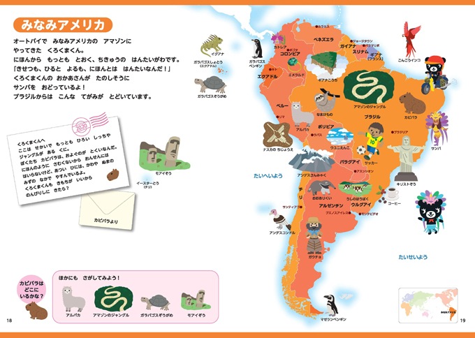 地域の名産や動物、名所をくろくまくんといっしょにさがしながら、あそびのなかで世界地図に親しみましょう。