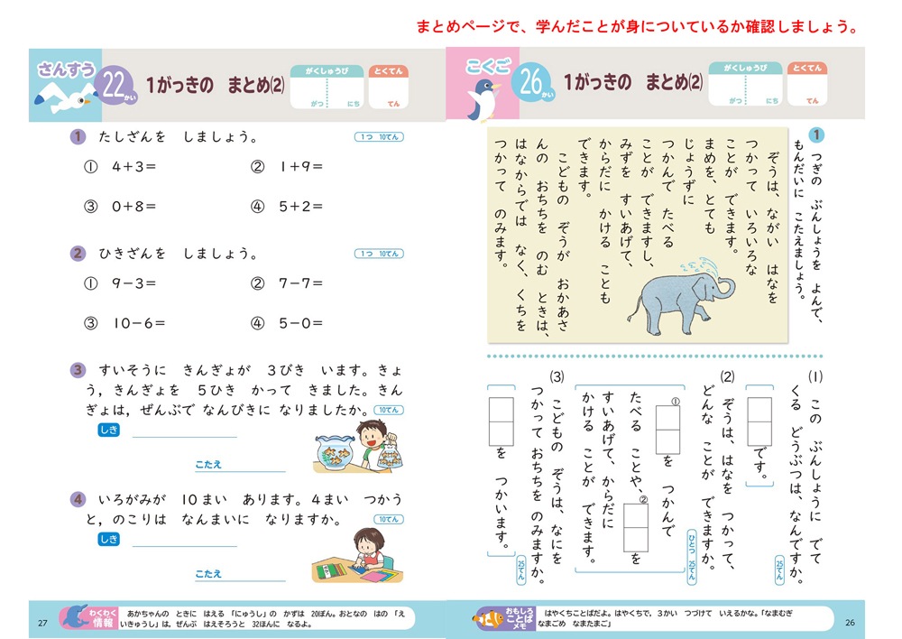 1学期の国語・算数の学習をしっかりおさらいできるので、2学期の準備に最適です。教科書対照表もついています。