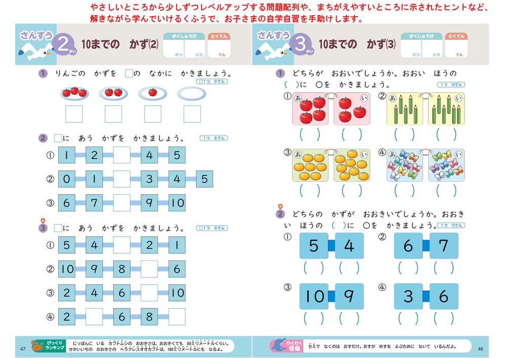 ②やさしいところから少しずつレベルアップする問題配列や、まちがえやすいところに示されたヒントなど、解きながら学んでいけるくふうで、お子さまの自学自習を手助けします。