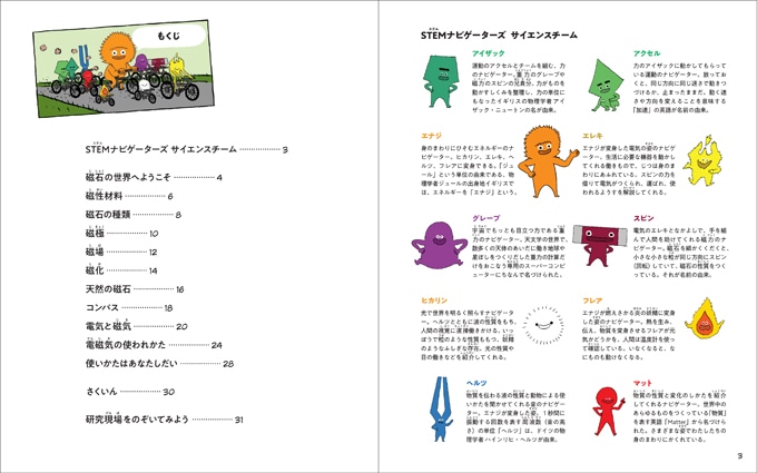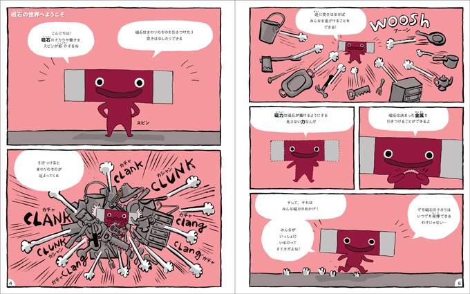 この巻のナビゲーターはスピン。磁石を細かくくだいていくと、小さな粒が同じ方向にスピン(回転)していて、磁石の性質をつくっていることが名前の由来です。ものを引きつけたり、つきはなしたりする魔性の存在で、電気と手を組んで人間を助けていることを紹介してくれます。