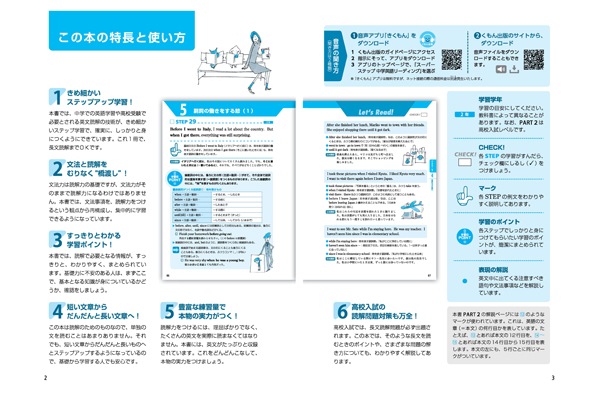 テスト勉強や高校受験で必要とされる英文読解の技術が、きめ細かいステップ学習で、確実に、しっかりと身につきます。
