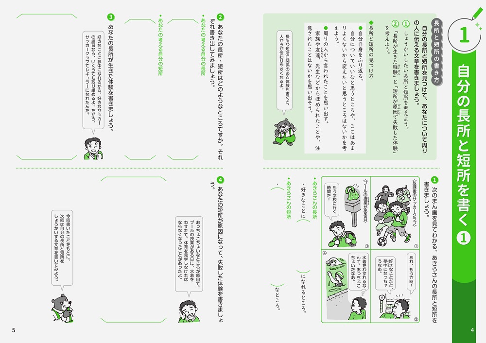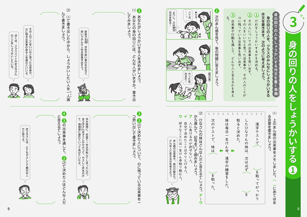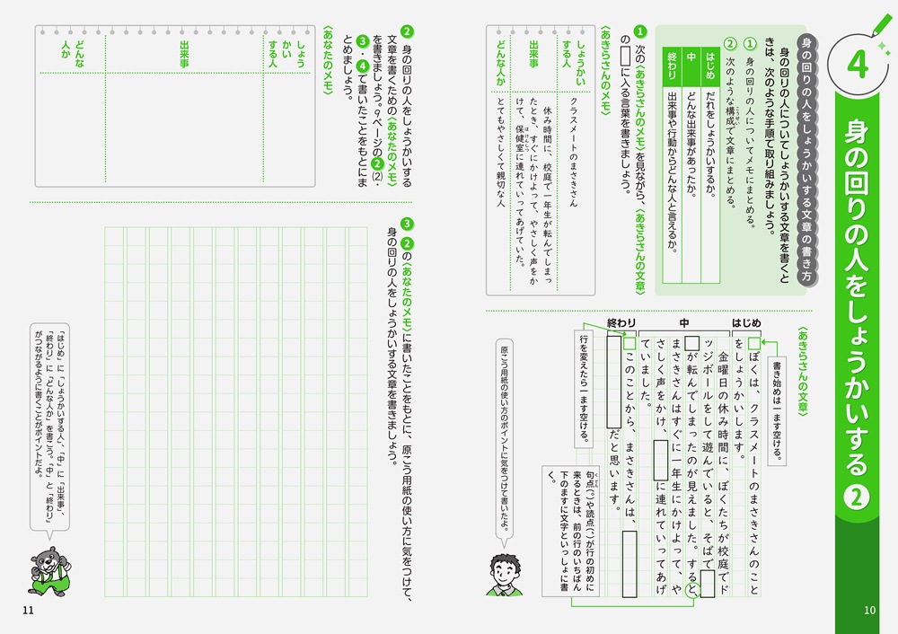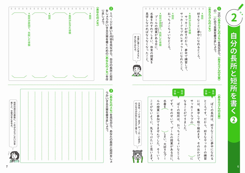 ③キャラクターの会話や作文例をヒントにメモや文章のまとめ方をおさえてから、自分自身について作文を書くので、スモールステップで無理なく取り組めます。