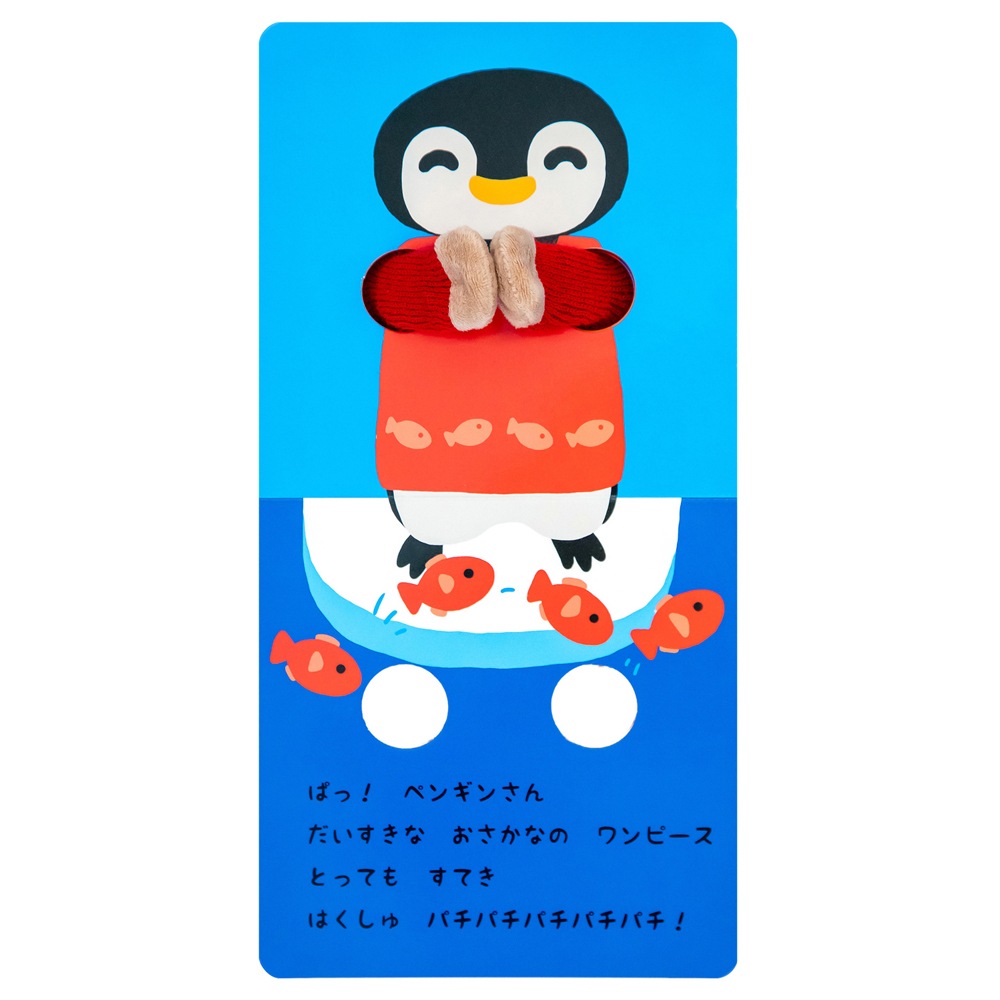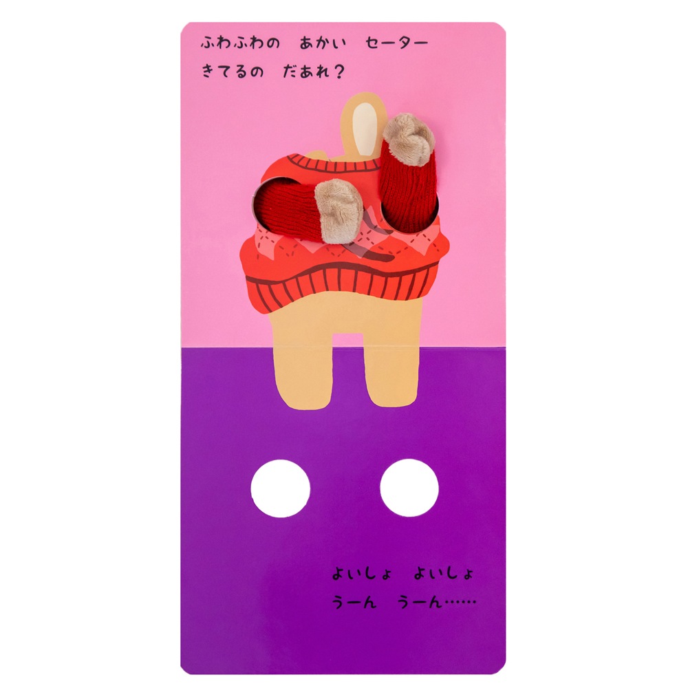 手を動かしながら読み進め、「あかいセーターきてるのだあれ?」「うさぎさん!」と、おきがえしている動物たちをあてっこしましょう。上手にきがえられると、動物たちがおどったり、拍手したり、ハグしたり、かわいいアクションで喜びます。