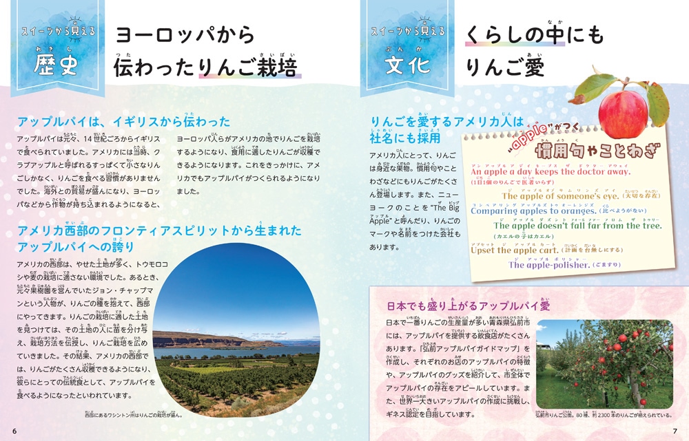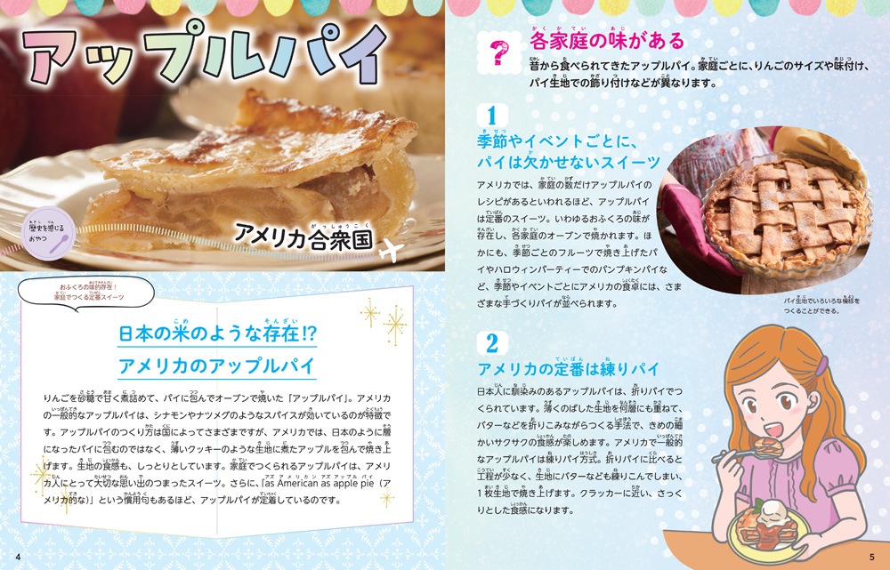 スイーツは、食文化はもとより、地理、社会、宗教などと密接です。だから、スイーツを入り口にすると、その国の産業、生活や文化、歴史、日本とのつながりなどが楽しくわかります。著者は定住旅行家のERIKOさん。定住旅行とは、観光地や宿泊施設に泊まるような一般的な旅とは違って、世界の日常を体験しに行く活動です。現地の家庭に長期滞在(1か月?3か月)し、家族の一員のようになって、暮らしを体験するのです。そんなERIKOさんが40近い国のスイーツを取り上げ、関連づけながら、それぞれの国のようすを紹介していきます。