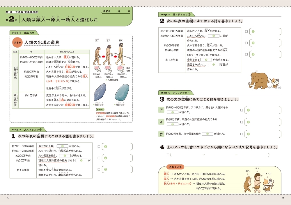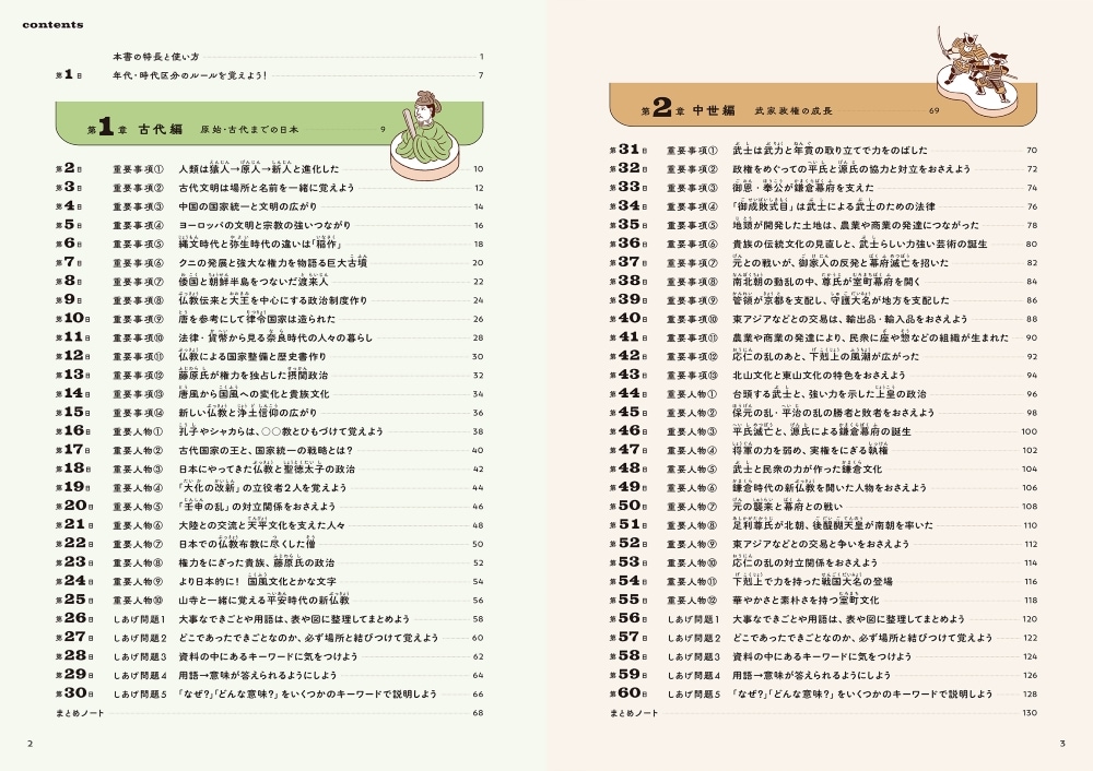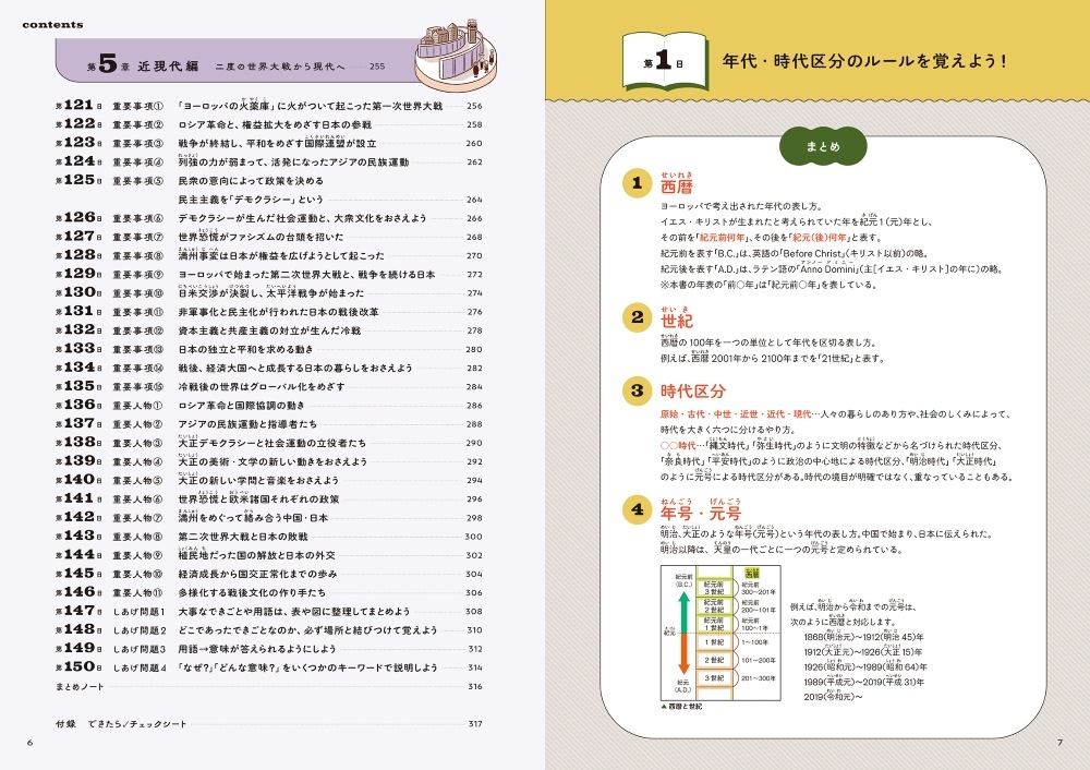 ・1日見開き2ページ、約15分の学習で、手軽に楽しく学ぶことができます。150日で、中学校で学ぶ日本と世界の歴史の流れが総ざらい。