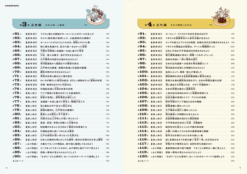 ・古代、中世、近世、近代、近現代の各時代を「重要事項」「重要人物」という二つの切り口でわかりやすく整理。年表やまとめを見ながらくり返し書き写すだけで、重要用語や重要人物が覚えられます。