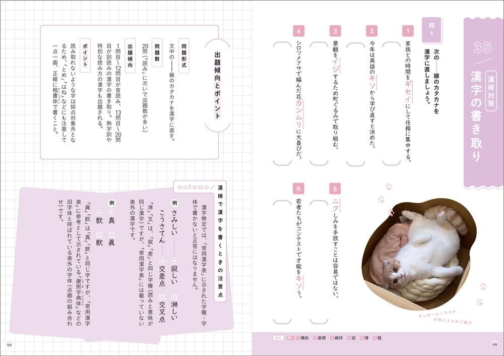 問題は、1日2ページずつのスモールステップで進められる構成で、漢字に関するコラムやパズル・クイズ形式など多様な問題を掲載。
