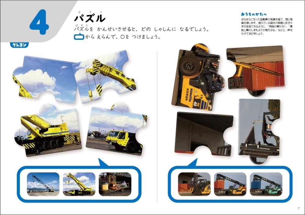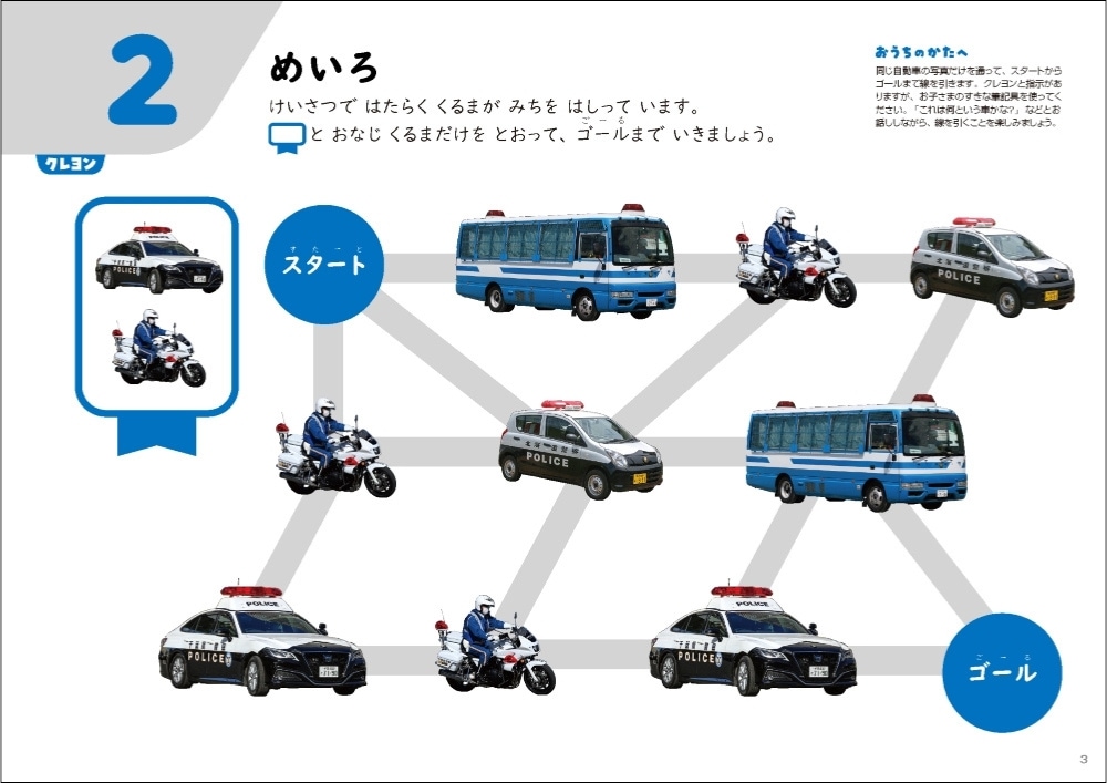 表面でパズルやめいろなどのワークに取り組み、裏面の図鑑で表に登場した乗り物の名前や特長などを確認することができるワークブックです。