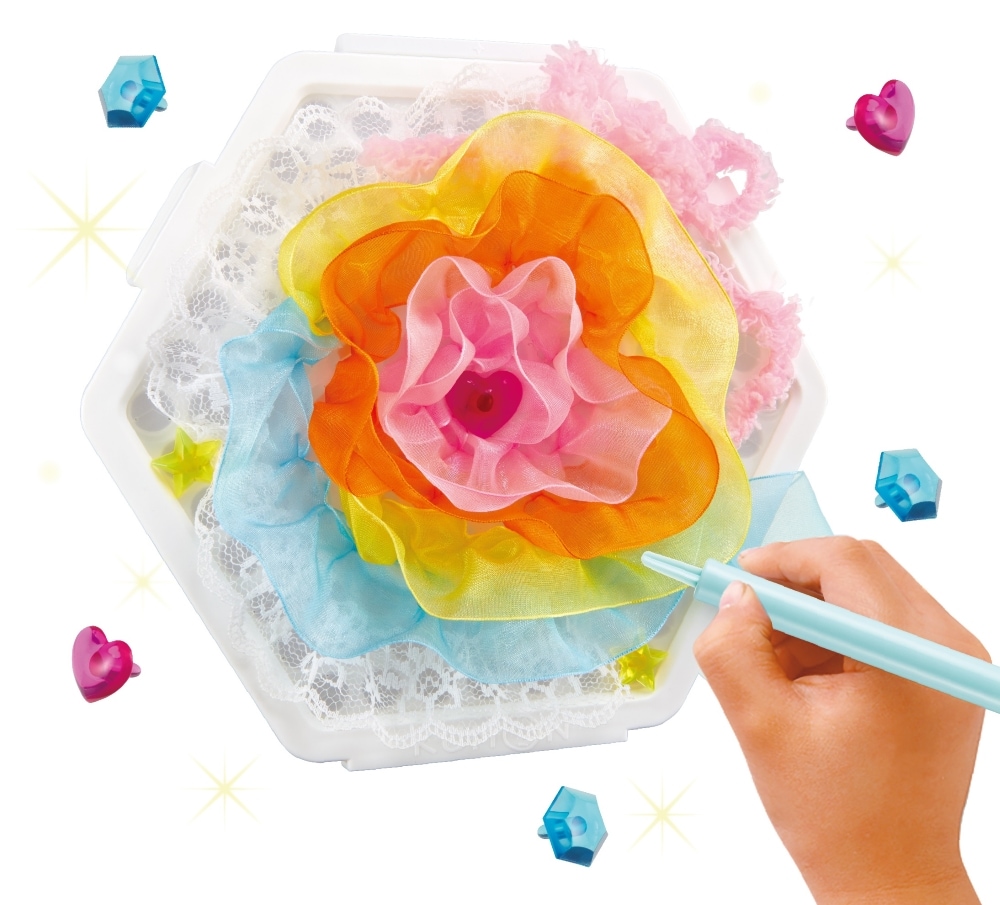 パレットの穴にリボンや毛糸、レースなどを押し込むだけで、簡単に立体的でかわいいリボンアートが作れるセットです。