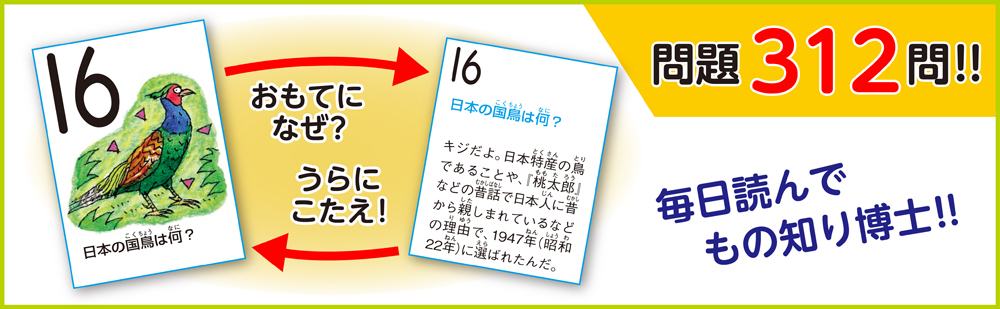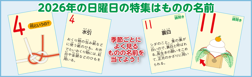 表の絵を見てその名前を当てるクイズ!裏面には答え(名称)と、その使われ方や意味などが掲載されています。日曜