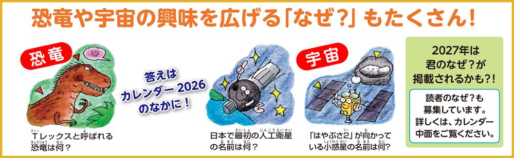 暮らし、動物、植物、昆虫、恐竜、乗り物、体、地球・宇宙、歴史、発明・発見、行事、言葉の楽しい「なぜ」が満載。