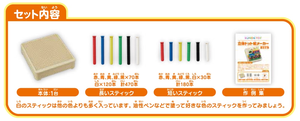 ■セット内容:本体:1台 長いスティック:470本(白×120本、赤・青・緑・黄・黒×70本)、短いスティック180本(各色×30本)、作例集:1部