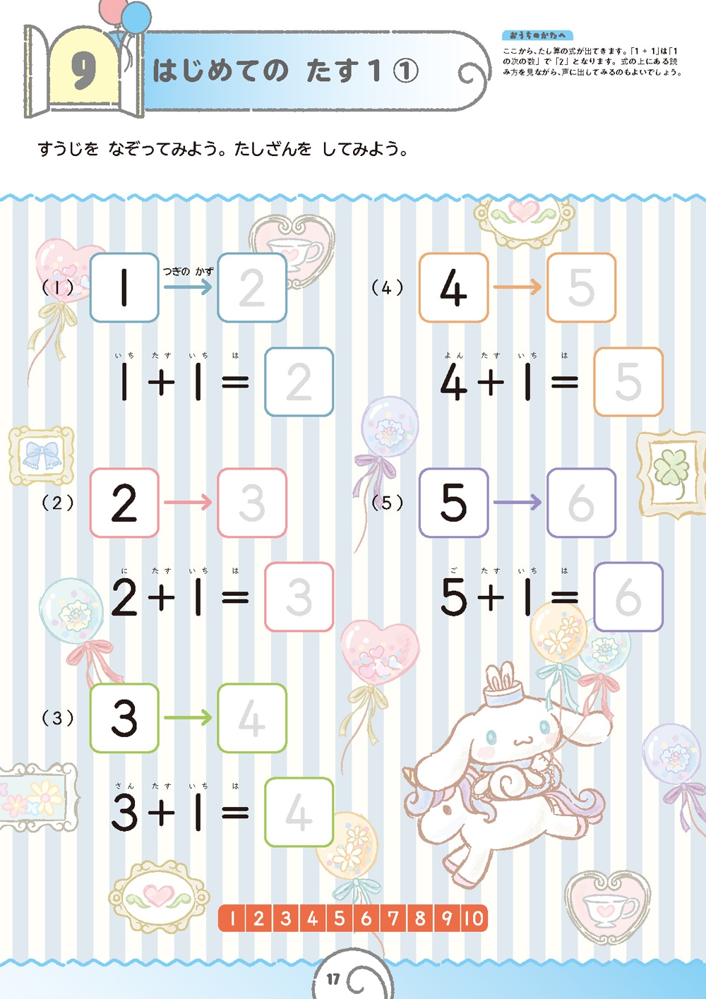 たす1からはじまって、たす数を1つずつふやしていきます。たす9までの足し算を学習します。