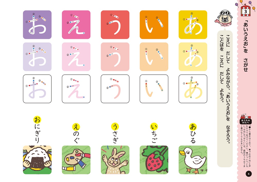 ・ひらがな1文字ずつが読めるようになってきた、いくつかのひらがなが書けるなど、ひらがなの読み書きに慣れてきたお子さま