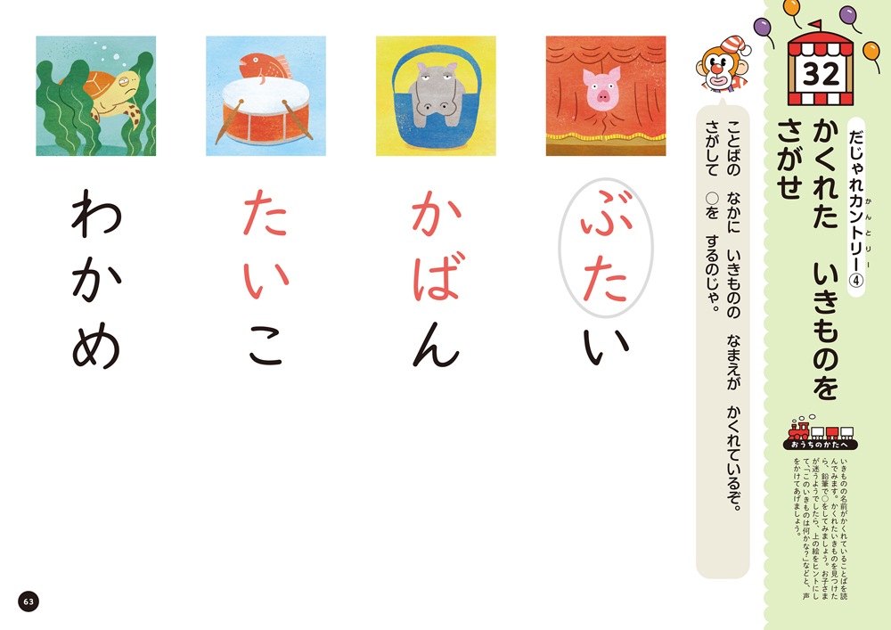 ・しりとりや回文、だじゃれなどを題材に楽しく練習に取り組めます。