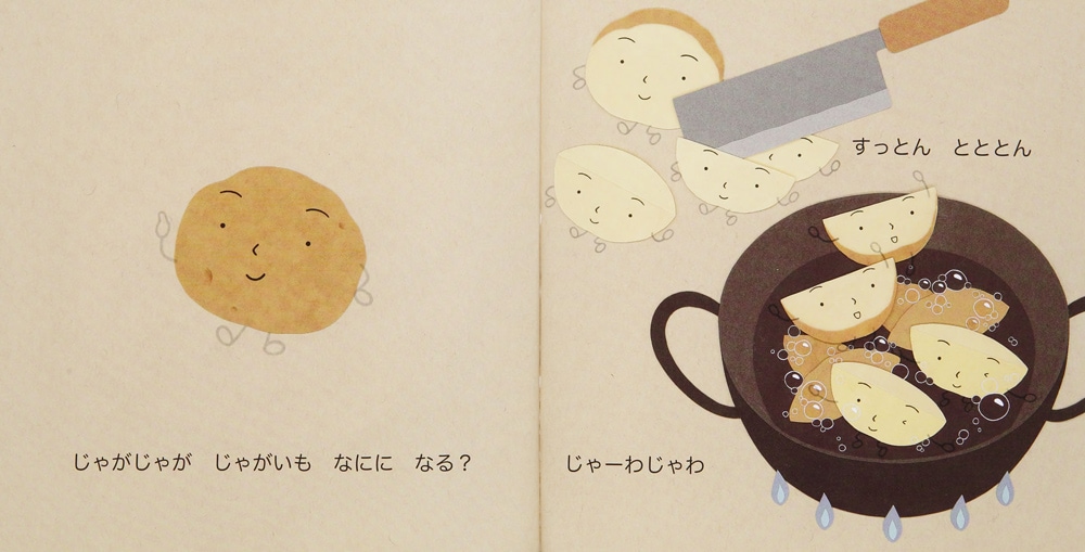 でこぼこ、ごろごろじゃがいもたちが、ことばのリズムにのって、いろんな料理に変身します。
