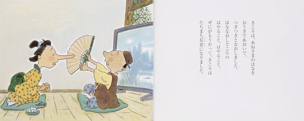 一本杉を切らない代わりに、不思議な扇を天狗にもらったきこり。それは表であおぐと鼻が高くなり、裏であおぐと鼻が低くなる不思議な扇でした。