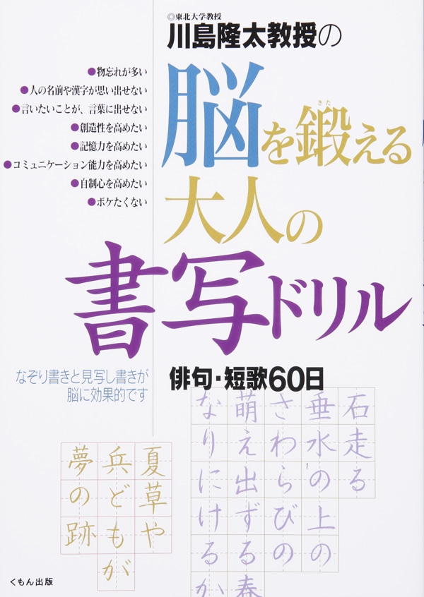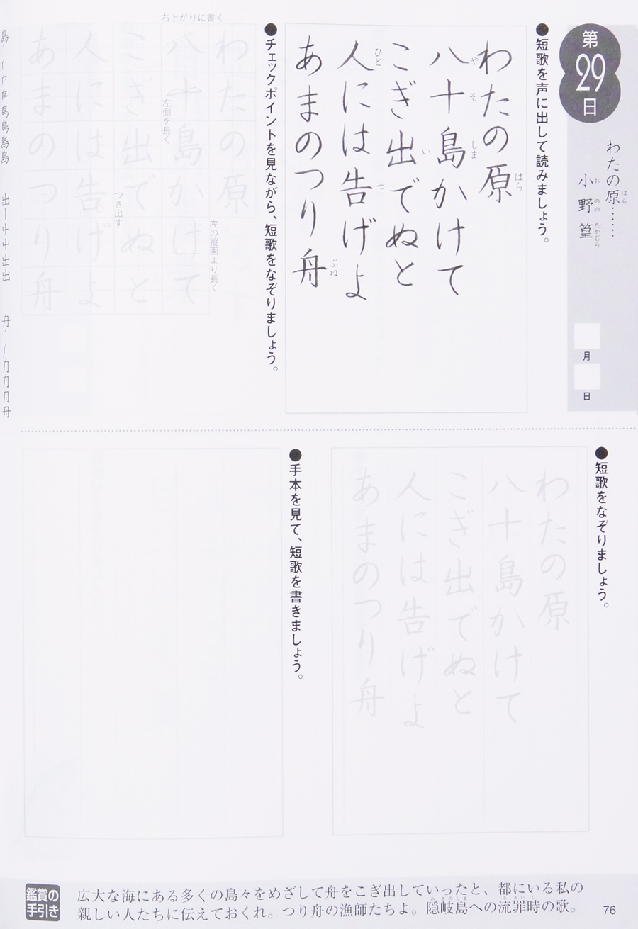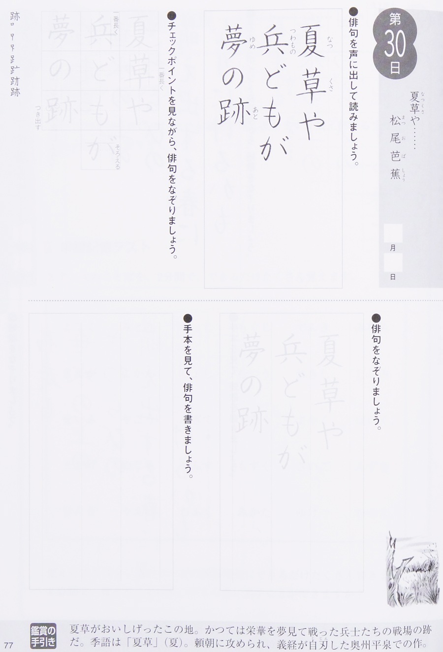 1日におもて面の俳句とうら面の短歌の書写を行います。親しみやすく、思わず声に出して読みたくなる名句60句、名歌60首を収録しています。文部科学省検定済教科書(書写)執筆者で文教大学講師の米本美雪先生による手本文字と書写指導により、脳を鍛えながら美しい文字が書けるように構成されています。