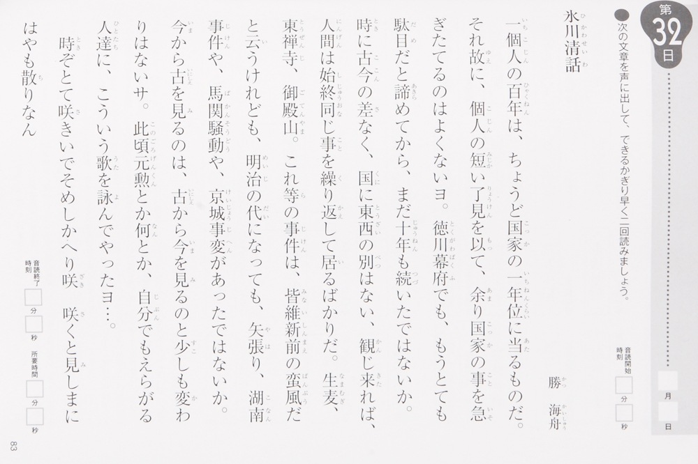 音読や見写し書きの文章の内容は、日ごろ使わない言葉もあるので、難しく感じるかもしれませんが、リズミカルな文章をすらすら読むことで、前頭前野が活発に働きます。