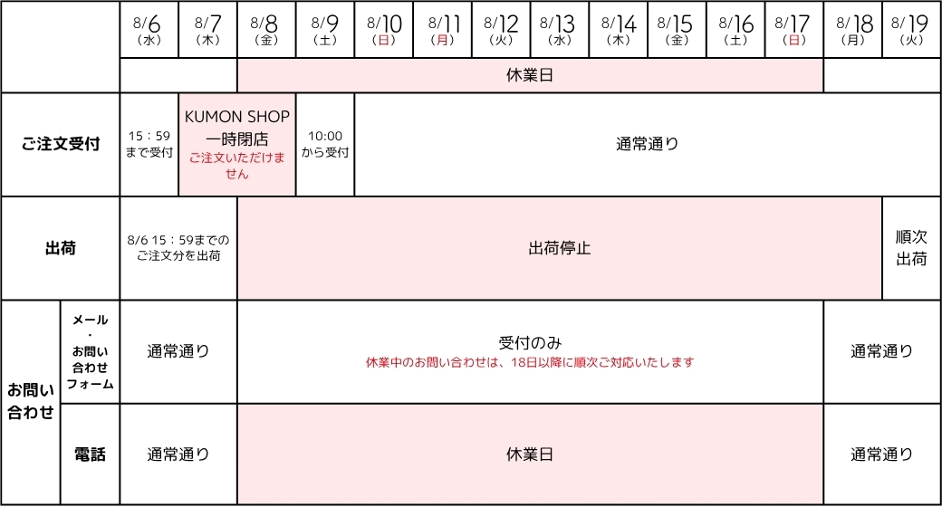 なお、夏季休業中にいただいたお問合せは、8月18日(月)以降順次ご対応いたしますが、お時間がかかる場合があります。